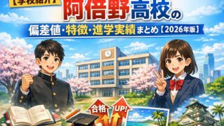 公立高校 【学校紹介】阿倍野高校の偏差値・特徴・進学実績まとめ【2026年版】 阿倍野高校の特徴、受験情報、学習支援、部活動、地域貢献、英語力向上に関する情報を紹介します。 2026.03.29 公立高校